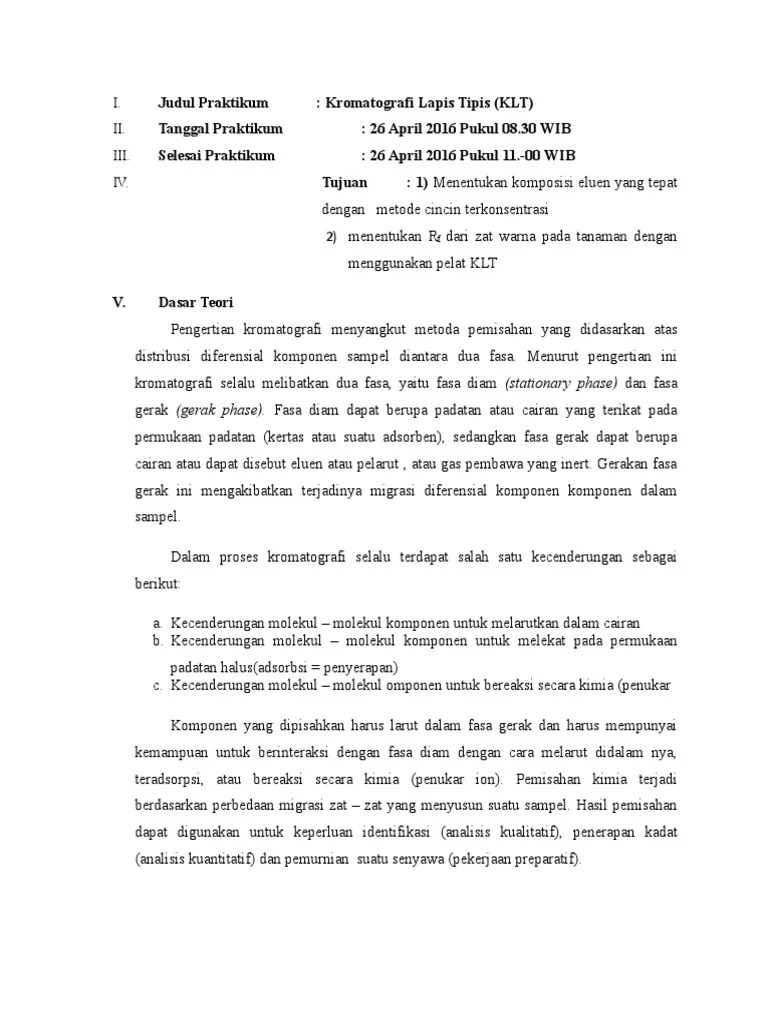 Laporan Klt / Laporan Praktikum Fitokimia K L T : Laporan praktikum kimia analisis klt.. Dimana fase diamnya adalah sebuah plat dengan ukuran ketebalan bervariasi. Pdf | on nov 30, 2020, indayana ratna sari published laporan praktikum kimia kromatografi lapis tipis | find, read and cite all the research you need on researchgate Seperti namanya, system ini khusus digunakan untuk spesies ion. Pemisahan dan identifikasi menggunakan kromatografi lapis tipis (klt) dan kromatografi kertas (kkt) serta mclakukan isolasi dan pemisahan senyawa kimia dari bahan alam menggunakan kromatografi kolom dan kromatografi cair vakum. Aras 1, 5, 6 dan 7, wisma pertanian sabah, jalan tasik (off jalan maktab gaya), luyang, beg berkunci no.